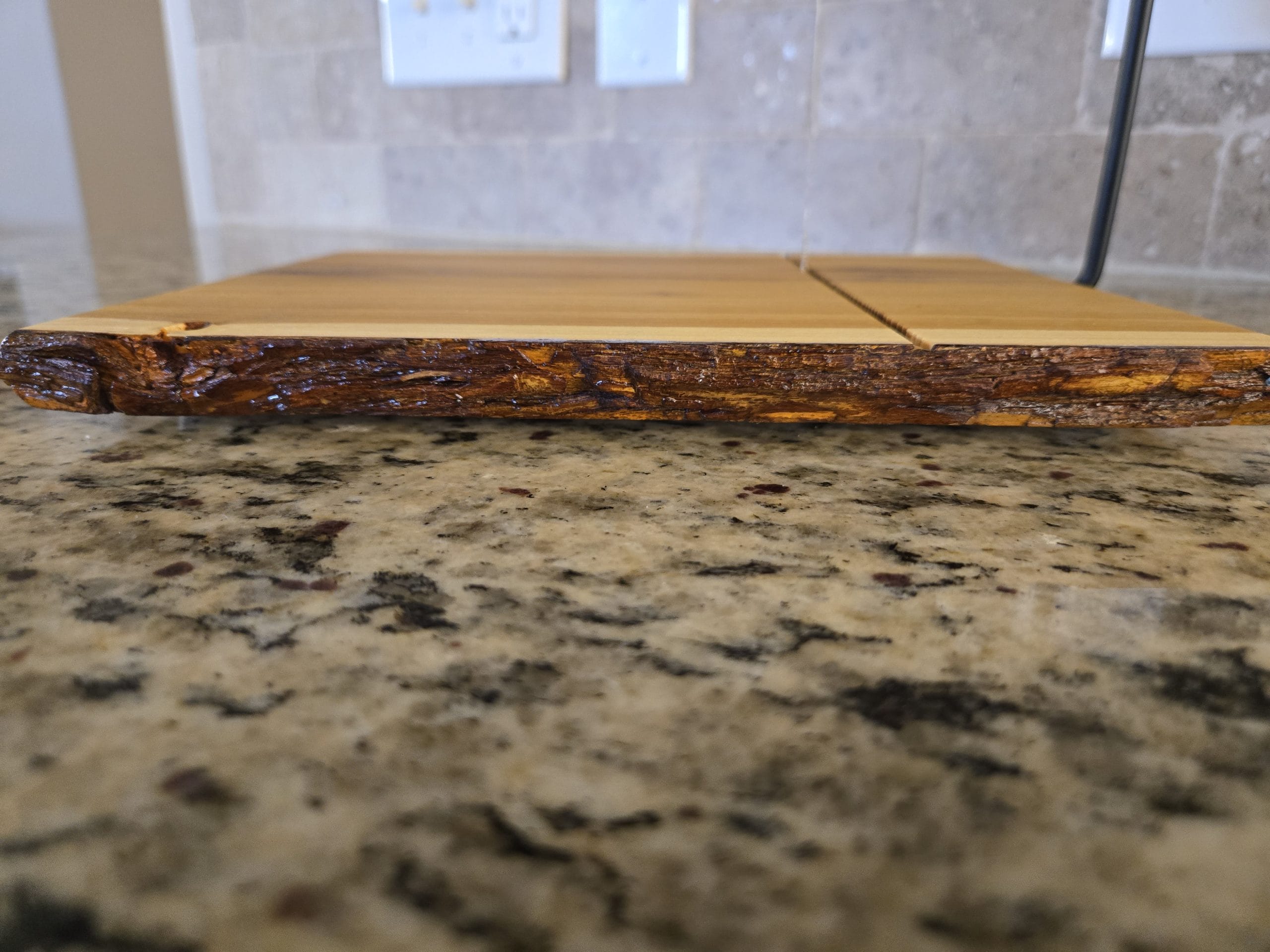 Indulge in the luxury of artisanal craftsmanship with this exquisite Live Edge Osage Orange Cheese Slicer. Handcrafted from premium Osage orange wood, this elegant yet functional piece showcases rich golden hues and intricate natural grain patterns, ensuring no two slicers are alike. The live edge design highlights the raw beauty of the wood, making it a statement piece for any gourmet spread or sophisticated gathering.