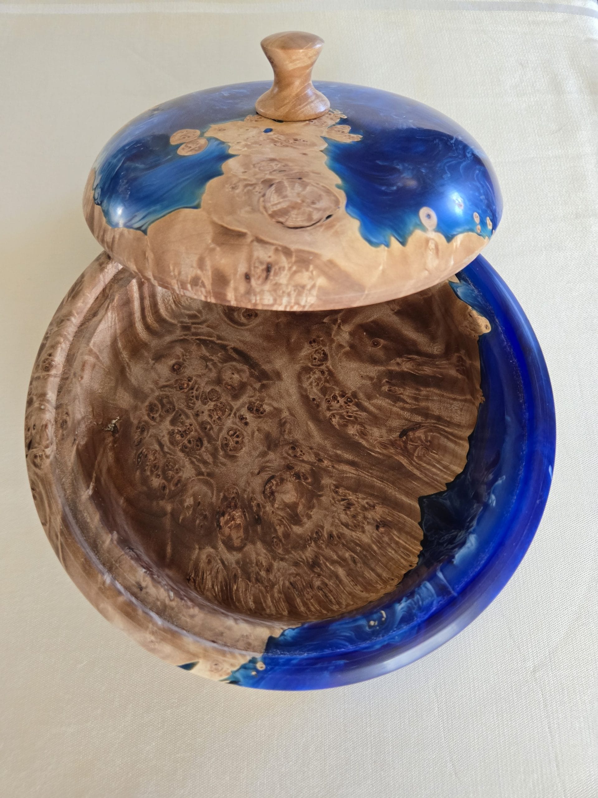 This exceptional lidded bowl is a masterpiece of craftsmanship, blending the organic beauty of natural burl wood with the celestial depth of richly pigmented resin. The seamless harmony between these two materials creates an enchanting visual contrast—warm, intricate wood grain complemented by the swirling patterns of deep blue resin, reminiscent of an ocean meeting the shore.